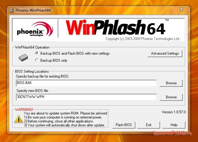 3) В папке находим и запускаем (от имени администратора, в Windows7) программу для прошивки BIOS, в моем случае это WinPhlash, также это может быть файл InsydeFlash. В программе жмем Flash BIOS.