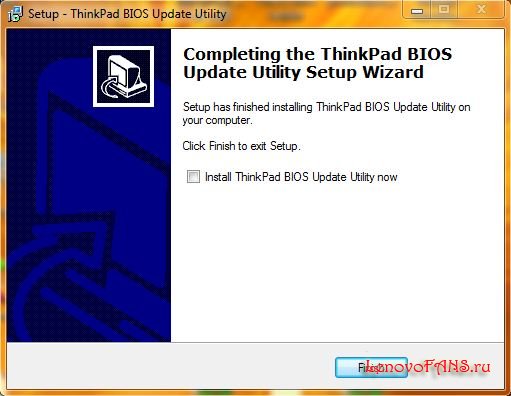 3) Снимите галочку "Install ThinkPad BIOS Update Utility now", на последнем экране мастера установки и нажмите кнопку "Готово".