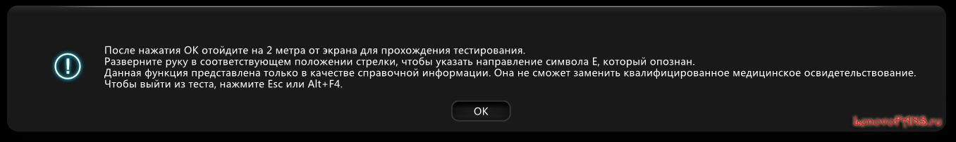 Чтобы запустить тестирование зрения, щелкните по клавише «Начать», расположенной под закладкой тестирования зрения. За этим последует процесс запуска камеры. После этого появится подсказка, как это показано ниже: