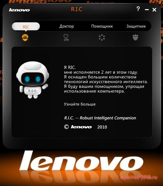Приложение Lenovo R.I.C. имеет приятный интерфейс в стиле Lenovo. При запуске открывается страница «О программе RIC» она отображается по умолчанию при открытии основного интерфейса Lenovo RIC. На этой странице вы найдете краткое введение в программу Lenovo RIC. Чтобы изучить более подробно, щелкните по «Узнать больше» в интерфейсе.