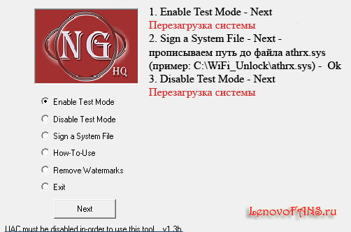 1. В архиве WiFi_Unlock.rar находятся драйвера, в папке Driver 7.7.0.259 Windows XP-для XP, в папке Driver 9.2.0.105 Windows Vista & 7-для Seven и Vista соответственно. Пользователям Windows 7 64-bit, необходимо подписать драйвер, для этого откройте папку Driver Signature Enforcement Overrider 1.3b (находится в архиве) и запустите находящуюся в ней программу dseo13b.exe, по очереди выполняем пункты как на скрине.