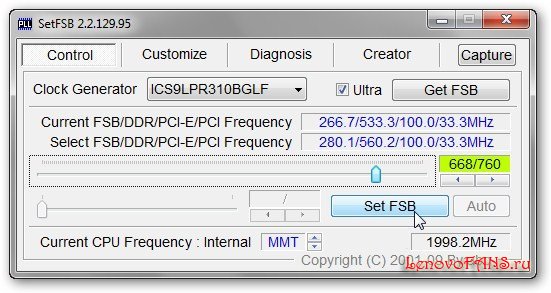 На экране должны появиться различные частоты, в том числе и ваша текущая в окошке «Current CPU Frequency». Например, у меня она составляет 1998,2 MHz и для того чтобы разогнать процессор мы в данном случае будем повышать системную шину. Для этого нужно подвинуть ползунок, находящийся в самом центре окна вправо, изменив частоту системной шины примерно на 10-15 МГц. Ничего другого здесь лучше не трогать, а если имеющегося диапазона недостаточно, то можно увеличить его, отметив галочкой «Ultra». Для того чтобы изменения вступили в силу, нажмите кнопку «Set FSB».