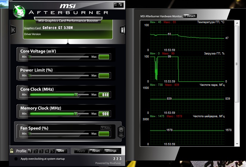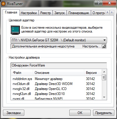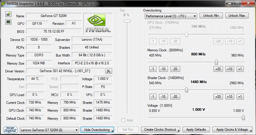Решил задуматься над этим вопросом. Распишу подробно чтобы было понятно всем пользователям. Конфигурация ноутбука без вмешательство аппаратных ускорителей: ![]() Посерфил на любимых ресурсах и откопал наиболее часто используемые, а в частности единственно используемые программы для аппаратного увеличения частот, и вот на чём остановился мой выбор: 1. RivaTuner 2. MSIAfterburner 3. Nvidia inspector Из всех трёх лично я выделил для себя №2, объясню почему. На мой взгляд данная программа наиболе приветлива к пользователю, наиболее понятна и адаптированна именно для моей модели ноутбука. Но давайте по порядку. №1 Оказалась громоздкой и вела себя неадекватно с драйверами серии 295.xx+. При первом же запуске не смогла определить дополнительные настройки для моей карты и поэтому в дальнейшем была удалена мной с криками : "Спарта!" Ни в коем случае не утверждаю что данная программа плоха или неадекватна, просто в сложившейся ситуации именно на ноутбуке с моей конфигурацией у меня сложилось впечатление которое я вам и описываю. ![]() №2 Как я упоминал выше именно №2 мы(как владельцы ноутбука со схожей конфигурацией с моим) будем использовать в качестве основной программы для нашего домашнего оверклокинга ![]() №3 Приятная на вид, но не пустила меня к регулированию частоты GpuClock. К плюсу можно отнести то что в этой программе есть возможность ручного бурста частоты Шейдеров что меня очень порадовало, поэтому после проведённых операций в №2 я немножко поигрался с частотным ползунком шейдеров именно в инспекторе. ![]() Overclocking: Конечно все знают о ответственности которую они несут вмешиваясь в частотный баланс апаратной части любого устройства, поэтому не буду никого ни о чём предупреждать) Играйтесь но не заигрывайтесь Самым правильным советом конечно же является повышение частот с минимальным интервалом 10-20Mhz максимум, с последующим увеличению мониторингом работы gpu и приростом температуры соответственно. Я использовал для проверки заданной мной частоты всем известную программу 3DMark6. Производил тестирование в повторяющемся режиме в количестве 2-3 раз для каждой операции увеличения частоты и пропуска. Для достоверности результатов которые вы хотите получить советую провести серьёзную оптимизацию системы в которой будете проводить все задуманные операции. Я считаю что графическу оболочку для Win лучше конечно устанавливать на режим максимальной производительности со всеми вытекающими последствиями(отключение аэро пиков и самого аэро как такового), но не считаю обязательным, так как наш 3DMark сам сменит тему оформления на упрощённую и вернёт всё на исходник при закрытии. А вот почистить темже CCleaner'om советую, для особо страждущих можно сделать чекдиск и провести дефрагментацию, но это уже извращения)) Итак закрыв все фоновые приложения вы запускаете MSIafterburner который автоматически определяет вашу установленную карту GT520M и открывает встроенный системный монитор для слежения за изменениями(кстати довольно неплохой монитор). Ну а дальше всё в ваших руках, все-таки упомяну что вы должны быть осторожны ;) Тестирование проводилось с такими настройками: ![]() Вот мои исходники: Дефолтные настройки: ![]() 3DMark6 показал такие результаты: ![]() Увеличение на 100Mhz (Внимание! я пропустил 5 шагов тестирования по понятным всем причинам, не рекомендую сразу выставлять такую разницу!): ![]() 