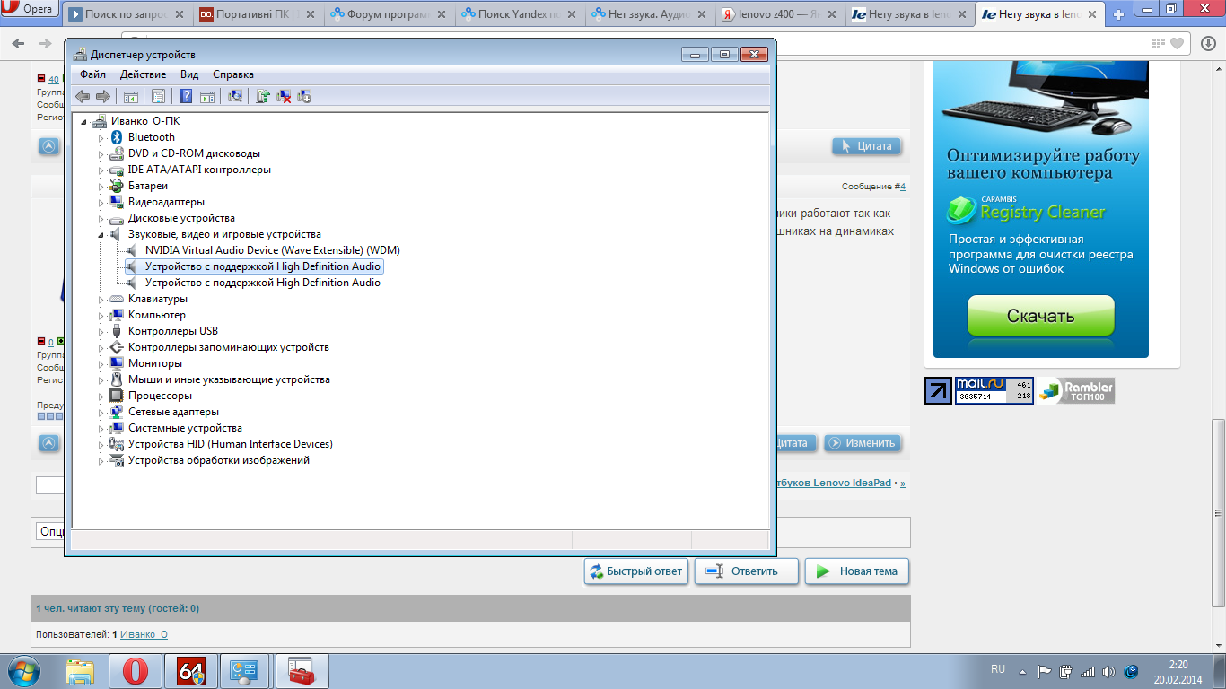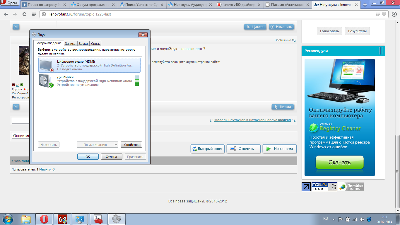 | Нету звука в lenovo z400. |