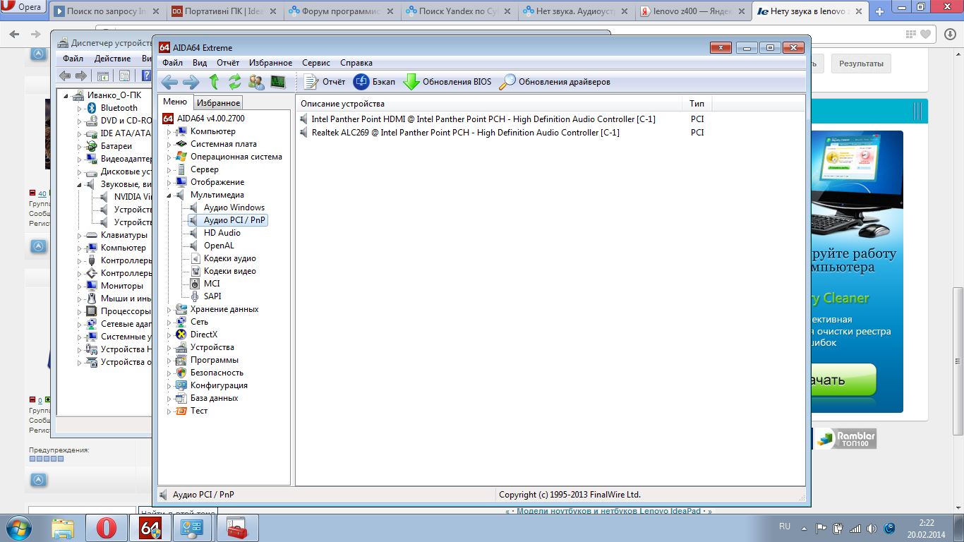 Спасайте!!! Помогите не могу ничего сделать со звуком уже 4 раза винду перебил, дрова самые свежие стоят, куча всяких оптимизаций пробовал искал в чем проблема но ничего не помогло, качал драйвера с офф сайта леново не работает всеравно. И дело в том что в наушниках воспроизводит без проблем а на родных нету. ПОМОГИТЕ!!! Сообщение отредактировал Иванко_О - 17 февраля 2014 03:47 |