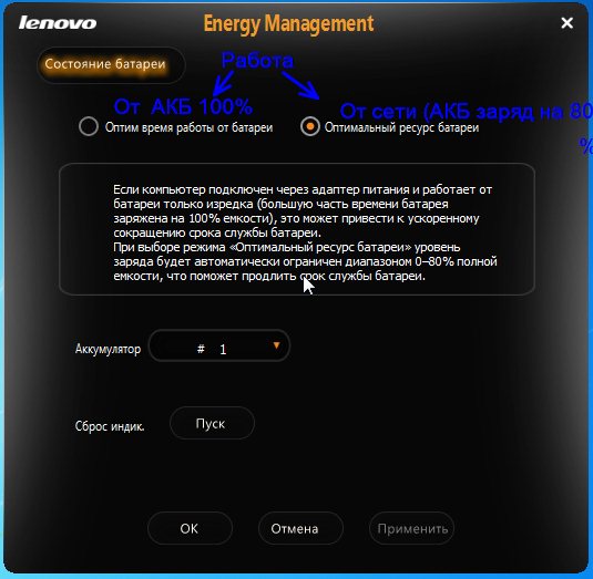 Добрый день! Как на ноуте Lenovo G 780 переключить режим питания так, чтобы батарея заряжалась не на 60 процентов (при обесточке сети заряда батареи хватает на 45 минут), а на все 100 процентов? Сейчас у меня "Моя настраиваемая схема": Отключение дисплея от батареи (20 минут),от сети (25 минут). Перевод компьютера в спящий режим : от батареи (25 минут),от сети (30 минут). Настроить яркость: от батареи и сети максимально (ползунок вправо до упора). |