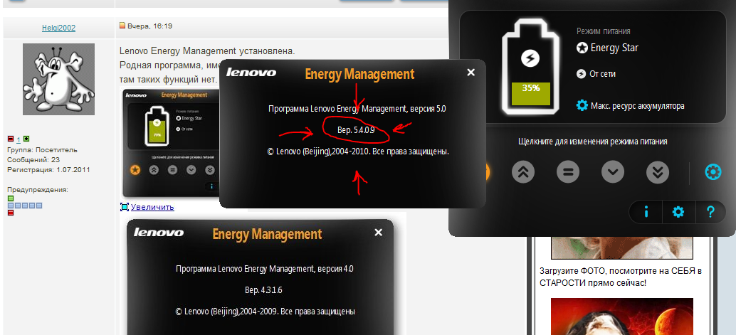 Что то не то. По ссылке скачалась версия 6.0.2.0 ![]() ![]() И там ничего нет про максимальный ресурс аккумулятора, как у вас на скриншоте (на скриншоте у вас версия 5.4.0.9) И ещё, в старой версии было 5 режимов питания, стало 4. Но это ладно. А вот почему нет возможности управлять состоянием батареи как на вашем скриншоте? ![]() Может надо именно версию как у вас: 5.4.0.9? Сообщение отредактировал Helgi2002 - 20 декабря 2011 11:40 -------------------- Lenovo S10-3 Windows7 Starter SP1 |